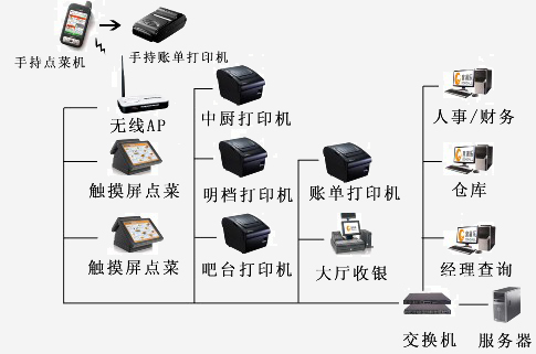 2. 輸入的信息由手持打印機(jī)即時打印給客戶,相關(guān)信息通過網(wǎng)絡(luò)傳輸?shù)綇N房、吧臺、大廳收銀的打印終端,進(jìn)行下一步提供菜品及結(jié)算的服務(wù)。